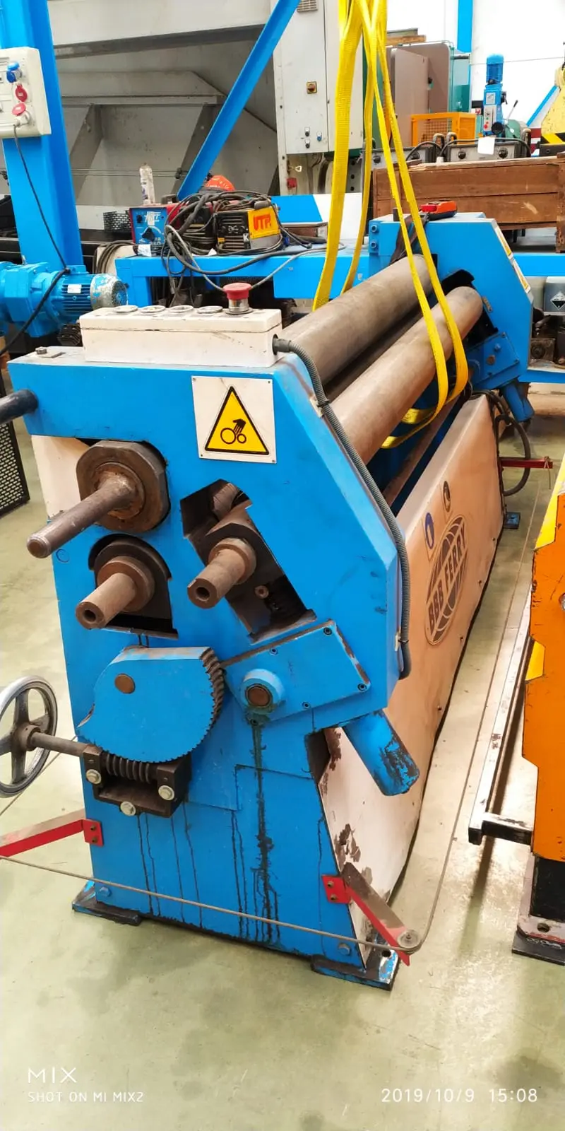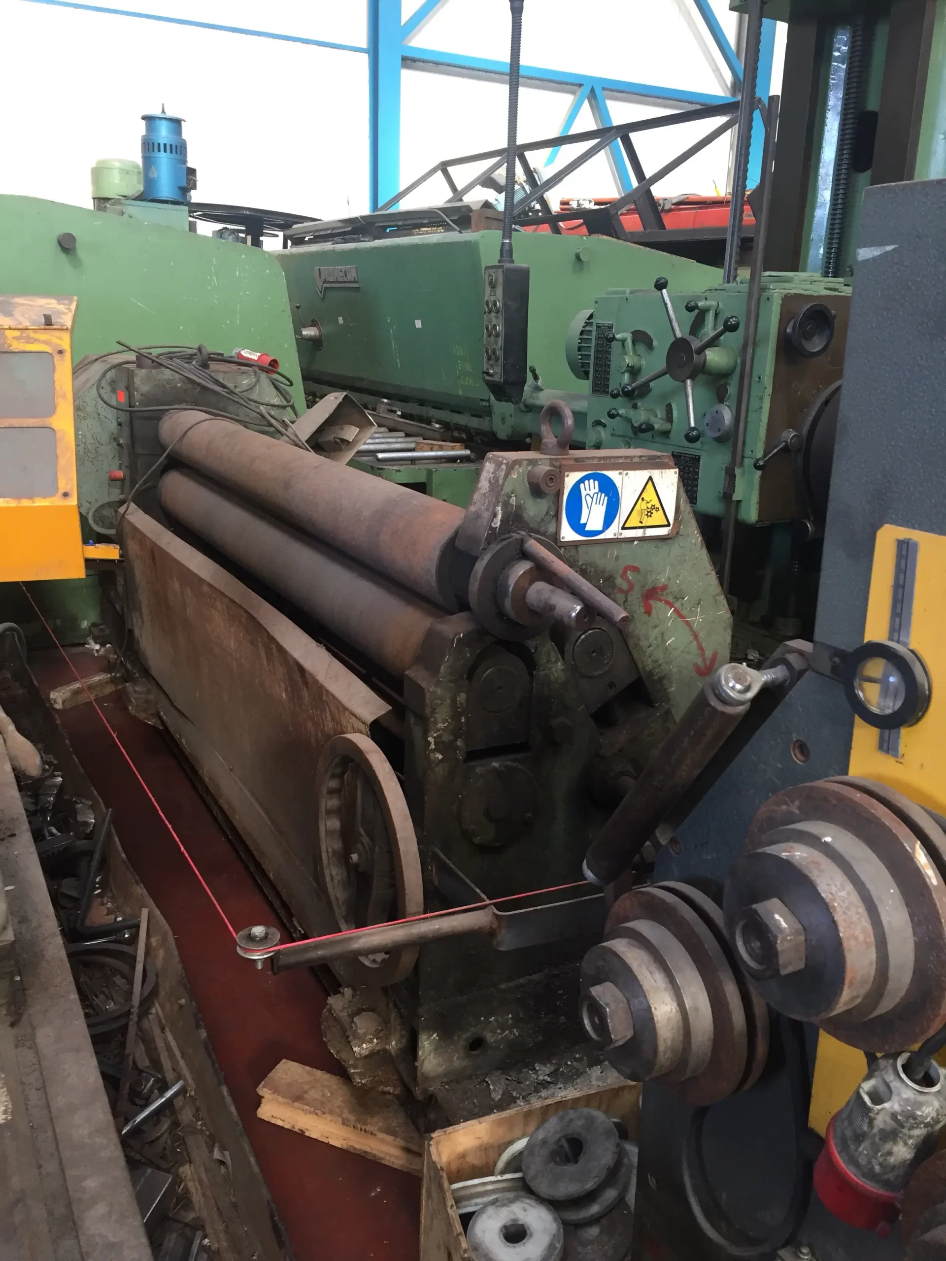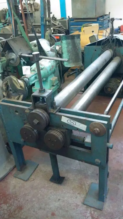 Cilindro motorizado asimétrico de 1.000x3mm Cilindro motorizado asimétrico de segunda mano en perfecto estado, se puede ver en nuestras instalaciones de Valdepeñas sin compromiso. Opcionalmente podemos adecuar este cilindro según normativa de seguridad vigente RD1215/97. Características técnicas: Longitud de curvado: 1.050mm Diámetro de eje: 90mm Detalle del volante de engranes